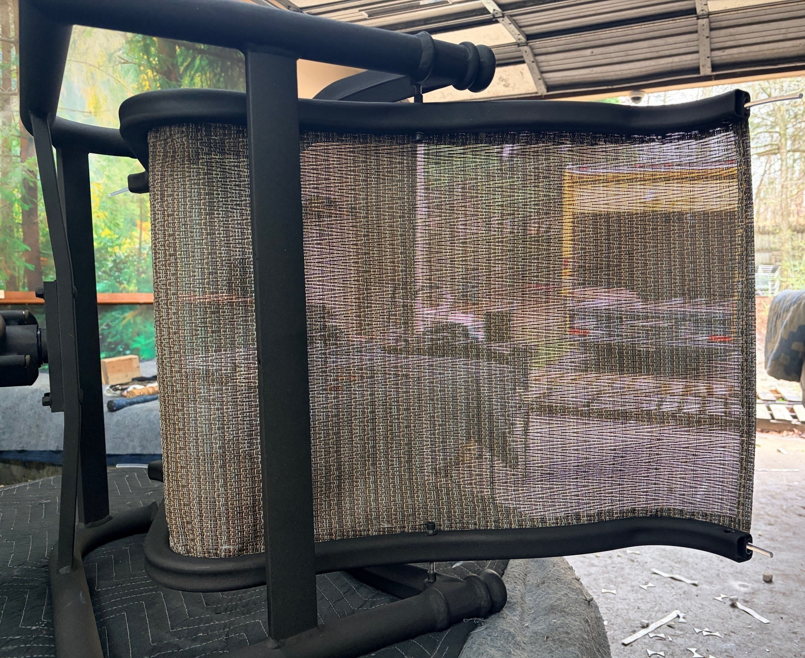 Feed in the new sling from the top, being careful not to snag the fabric on the metal frame. The ends of the metal frame tracks may have sharp interior edges. Occasionally in the shop we will file those interior edges slightly to help with thicker fabrics. Having a partner to pull or push will make the job much easier.