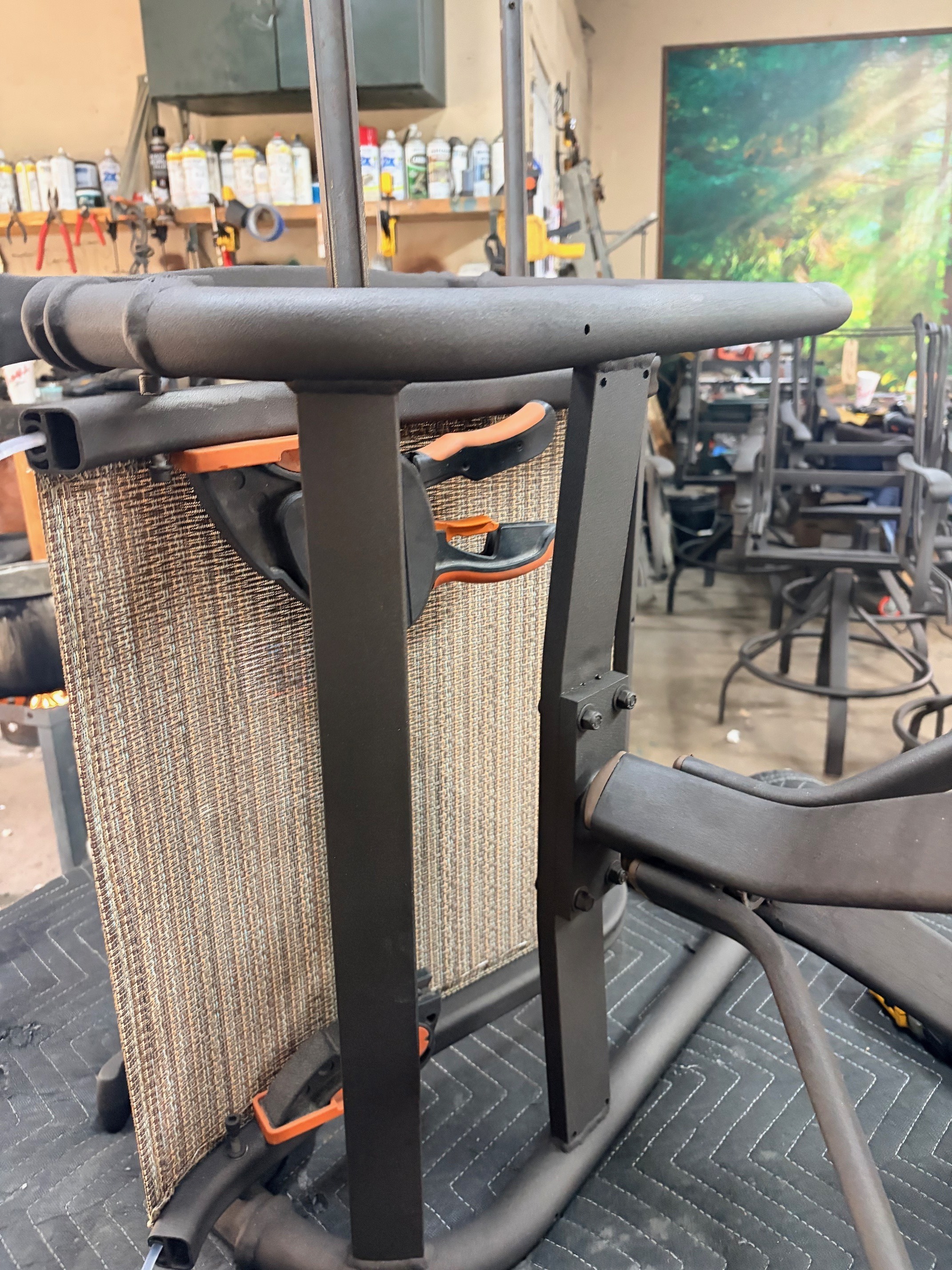 Below we are using our Spreader Tool that we make and powdercoat here at our shop to stretch the fabric.