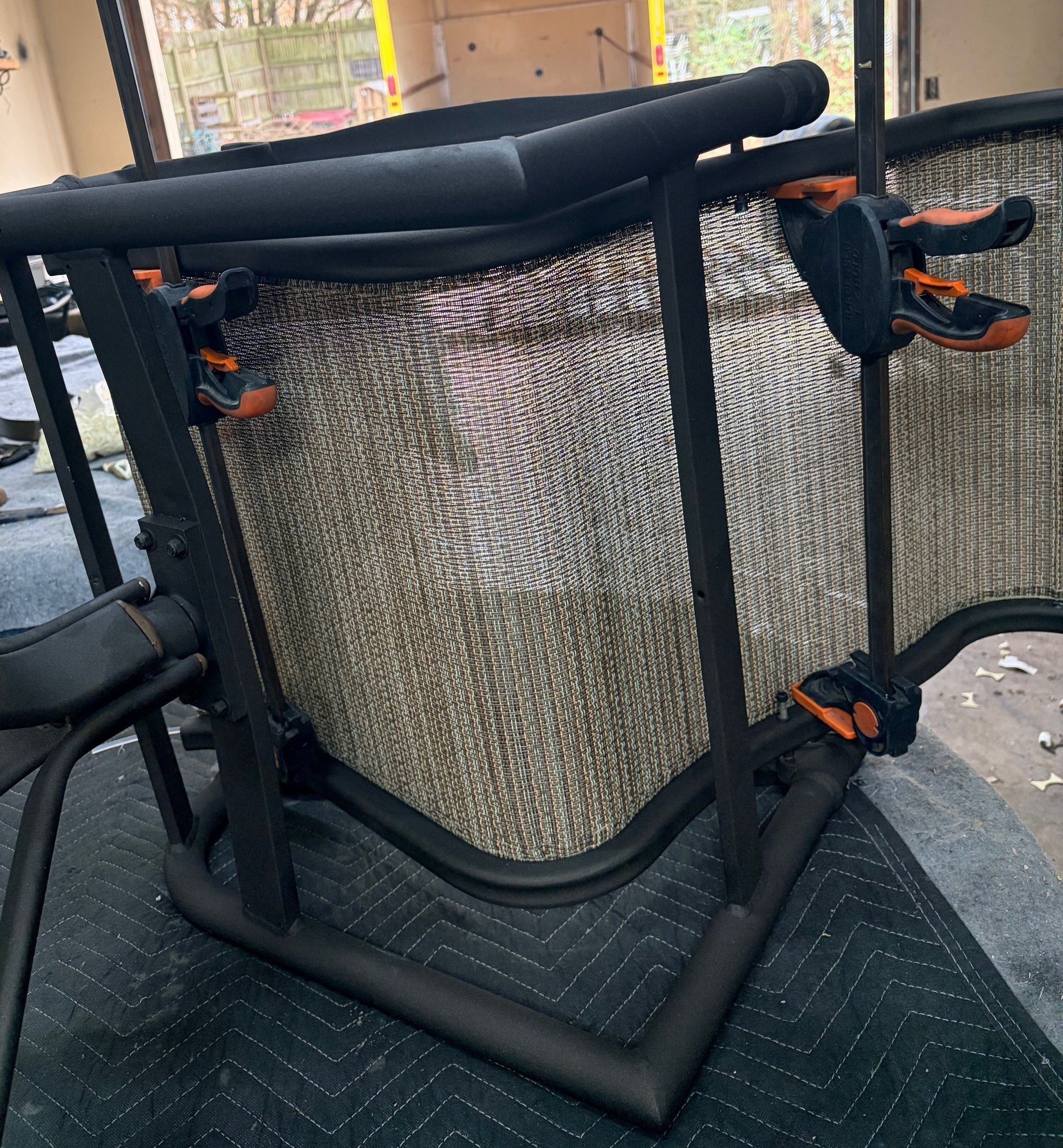 By hand, or using the pliers, grip the new sling material on the seam and pull to the end of the frame, whereas the fabric lines up with the end of the metal frame track.